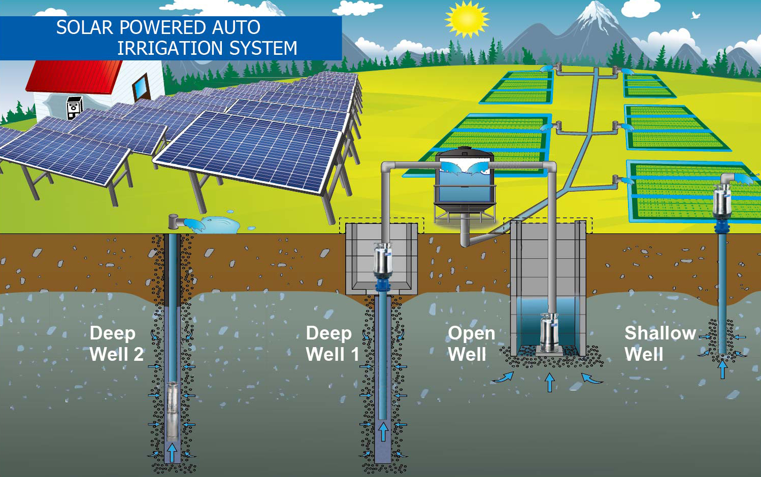 The System consists of a set of solar panel module, a control box and a submersible pump. The submersible pump has to accommodate the AC power supply (between 30Hz and 50Hz) which is converted from DC output of the solar panels by inverter. The sub-mersible pump is installed in a deep well and this pump has to be able to handle this sort of application and working condition.